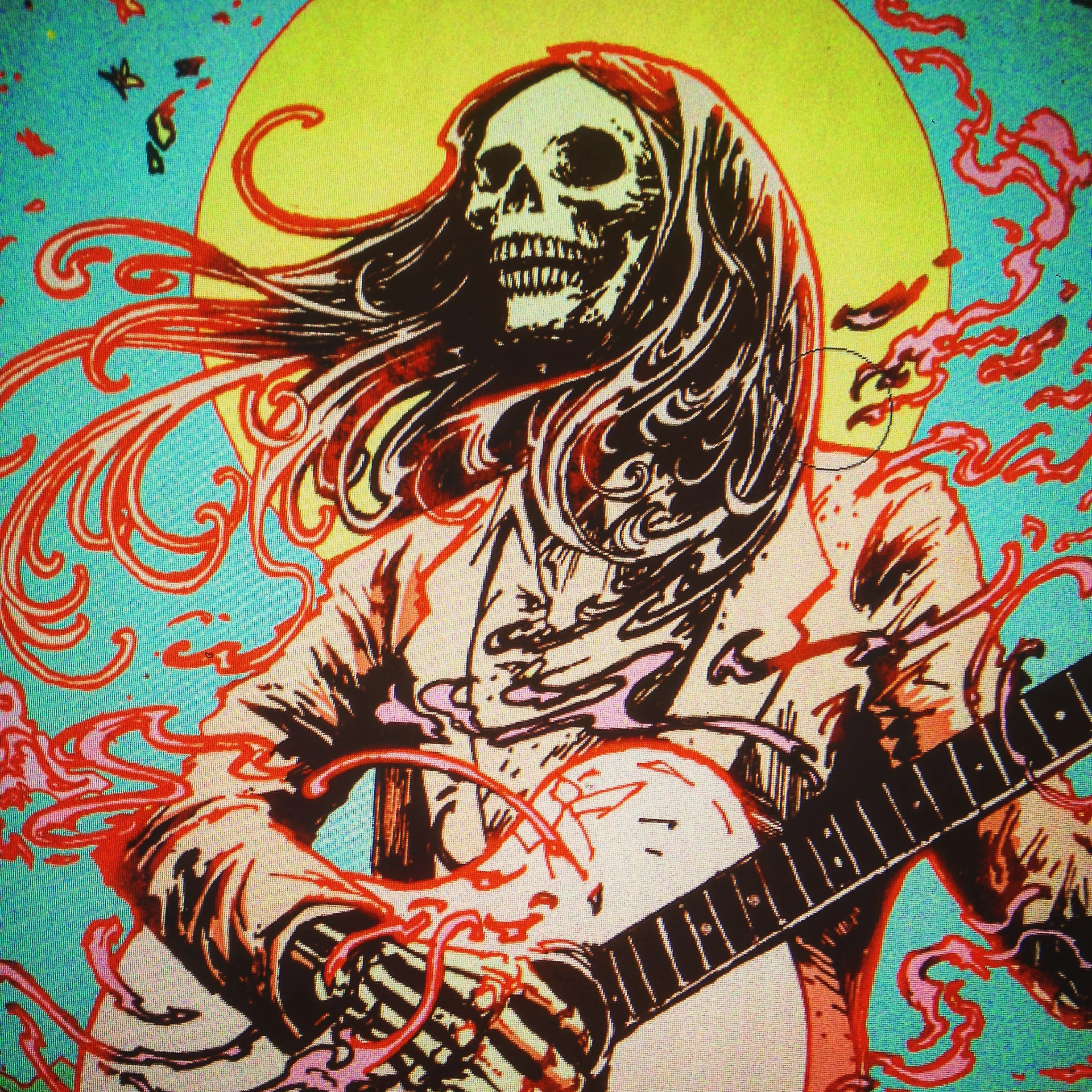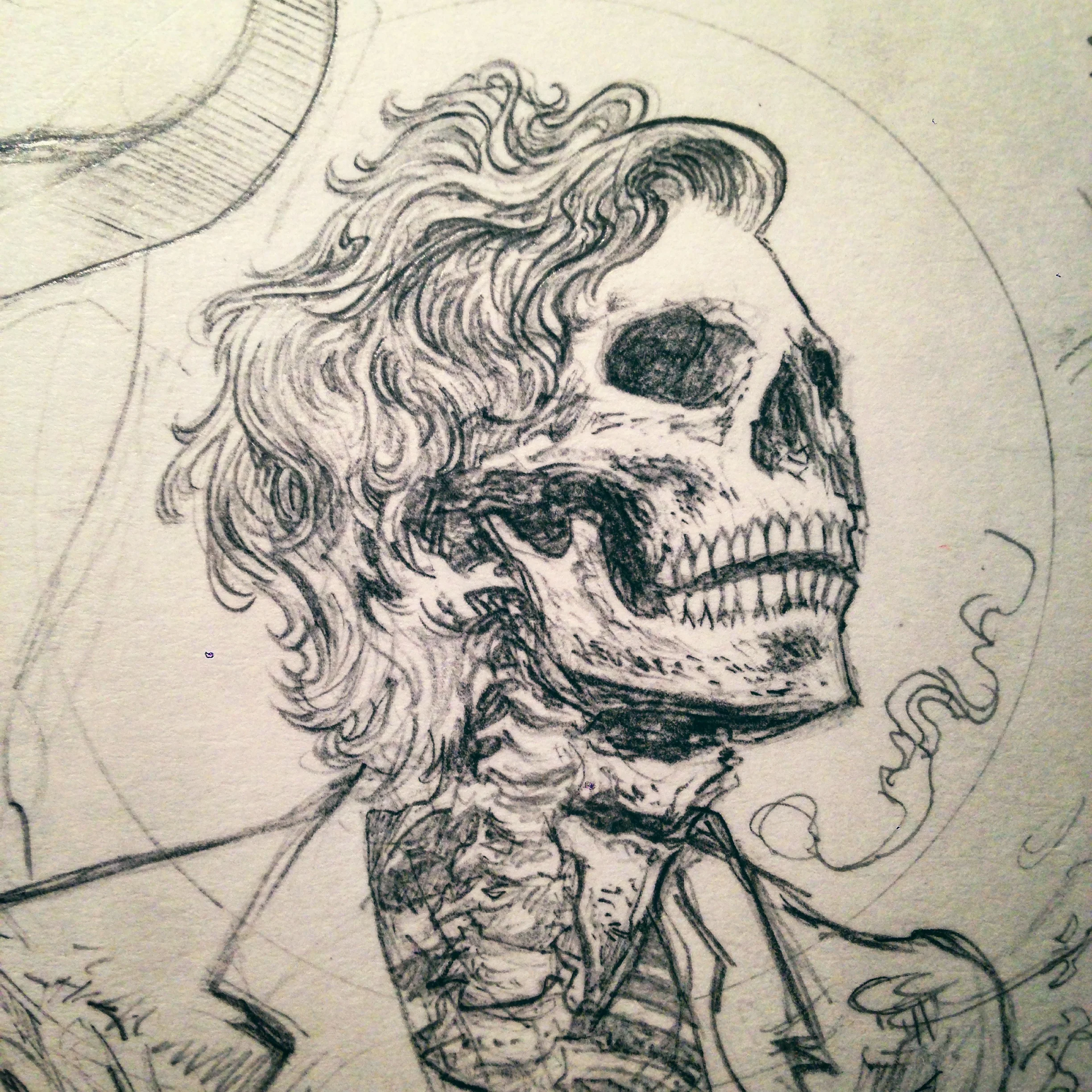 The border of the Mucha piece was cut out and filled with new pieces based on one of the [incredibly] loose thumbnails. I was originally going to illustrate the entire touring band, but didn't have the time to add them later on (tight timeline). This image serves as a safety net for the illustration so I know the gist of where I'll be taking things while keeping it all very loose. I did versions collages both with and without skin but ended up interpreting details over the tracings.