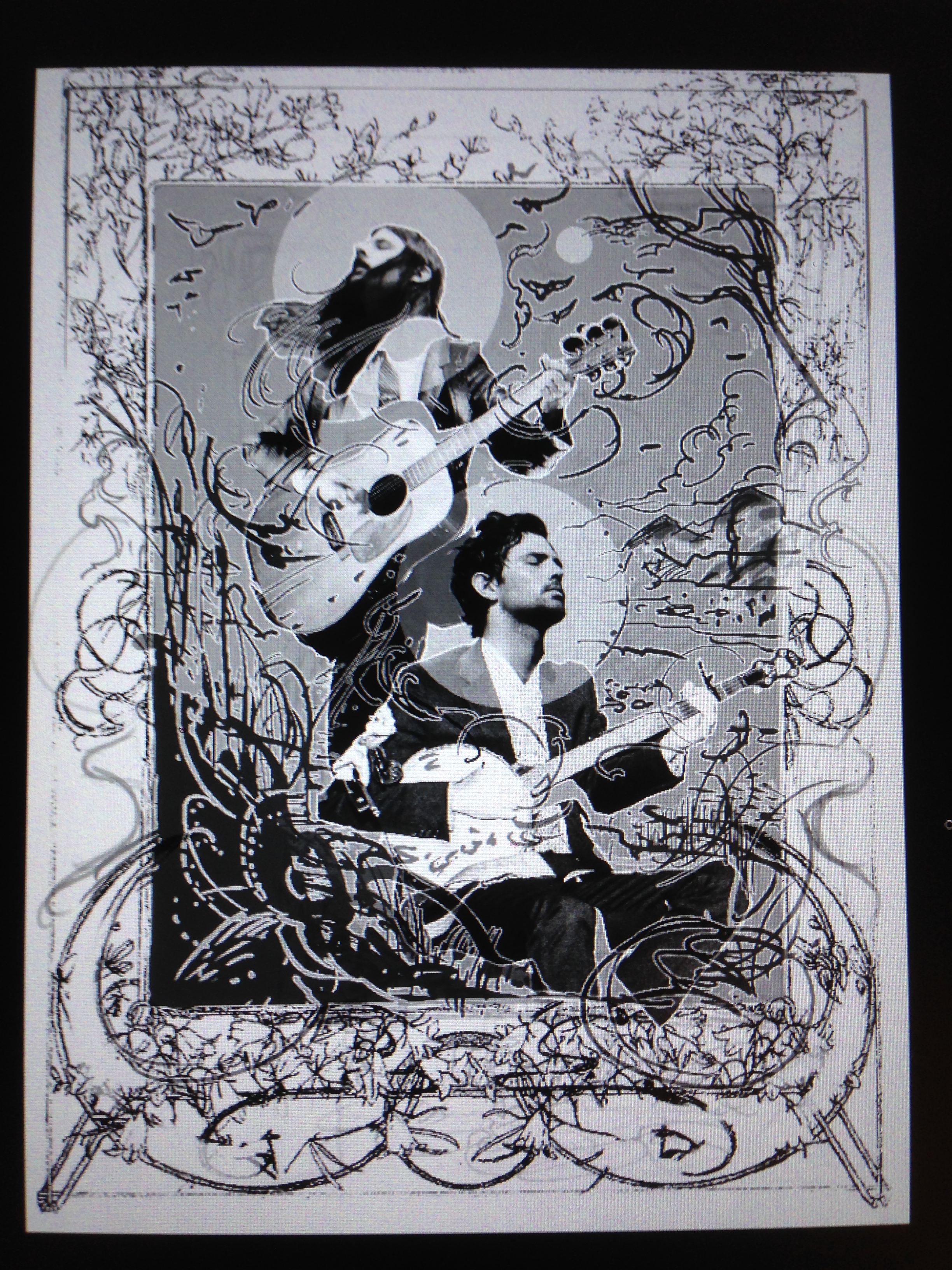 The unifying idea is that both the Grateful Dead and The Avett Brothers are longstanding folk rock groups with a rich visual history documented in poster art known with a known affinity for the ornamentation of Art Nouveau.as well as their use of collage. So with that reasoning, I did some absent-minded doodling, thinking of ways of serializing that previous poster and suggesting an evolution.